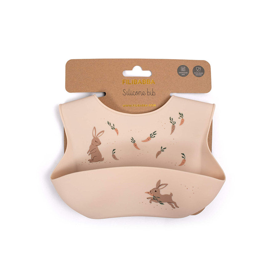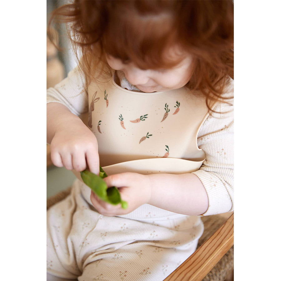 Das Lätzchen aus Silikon von Filibabba schützt Kinder beim Essen und fängt Nahrung und Flüssigkeit im praktischen Auffangfach am unteren Rand auf.