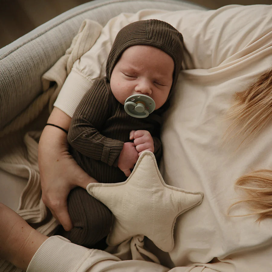 Der Schnuller "Moon" des dänischen Labels Frigg ist sowohl bei Müttern als auch bei Babys beliebt und ermöglicht es deinem Kind, sich selbst zu beruhigen, indem es seinen instinktiven Sauginstinkt auf möglichst natürliche Weise ausübt.
