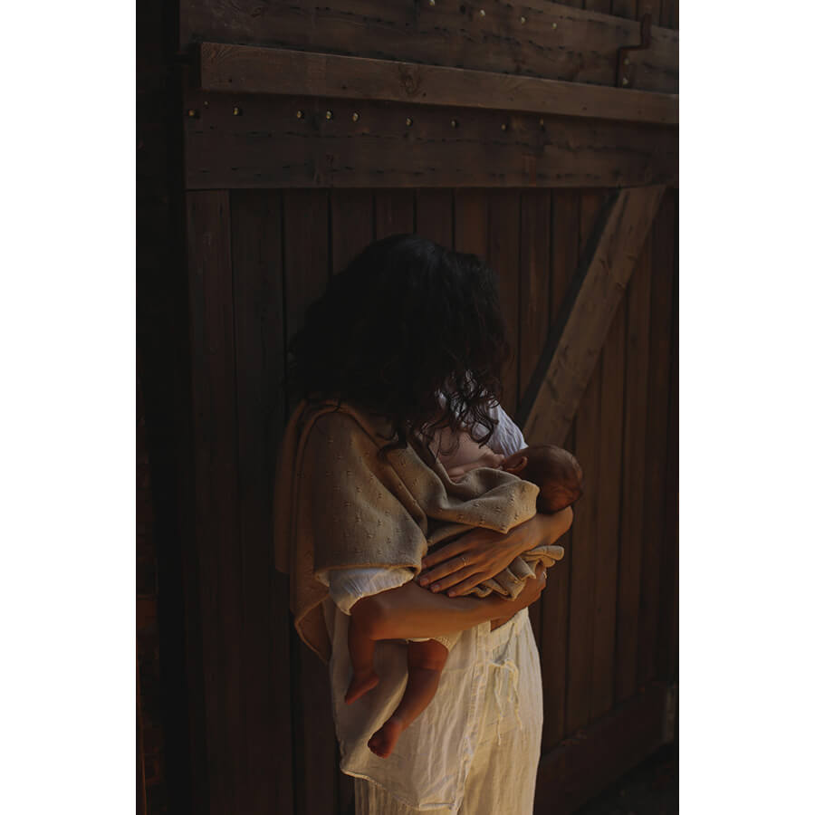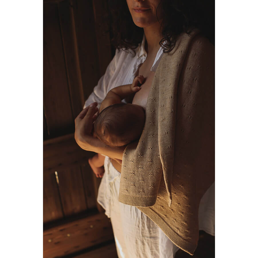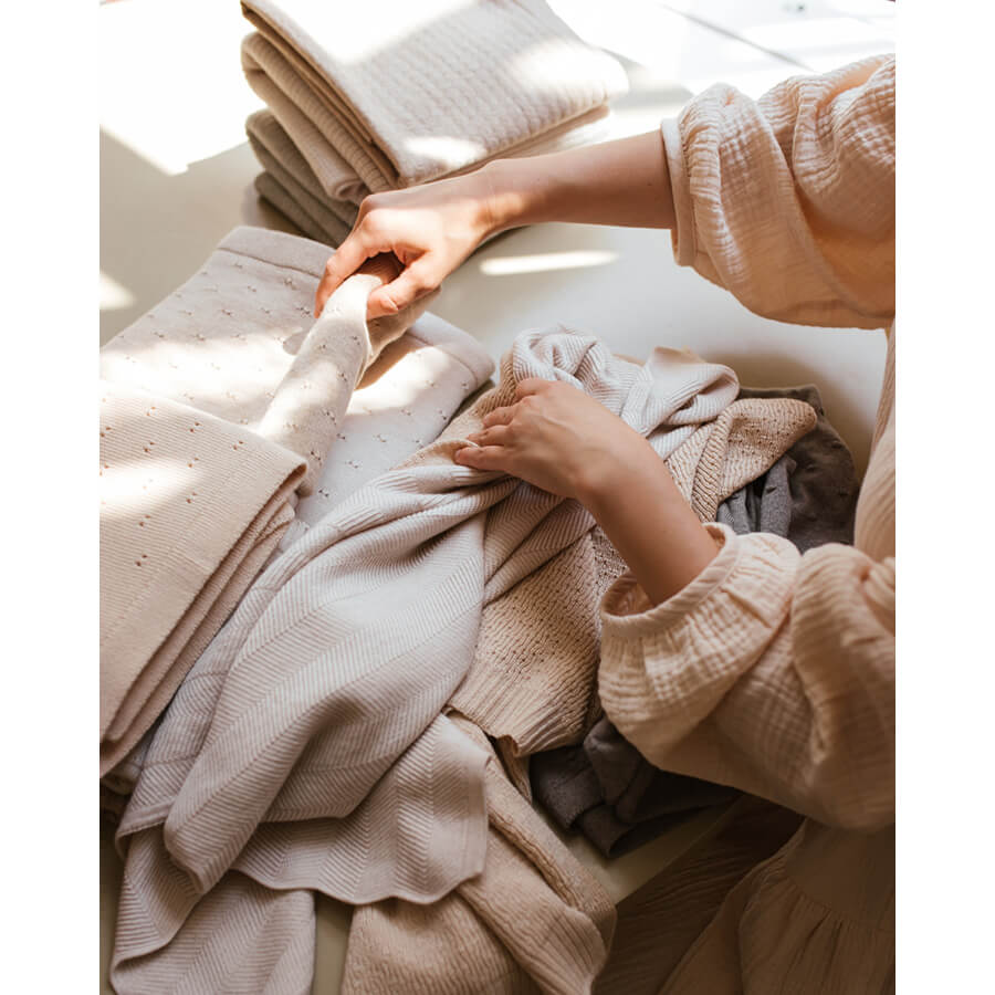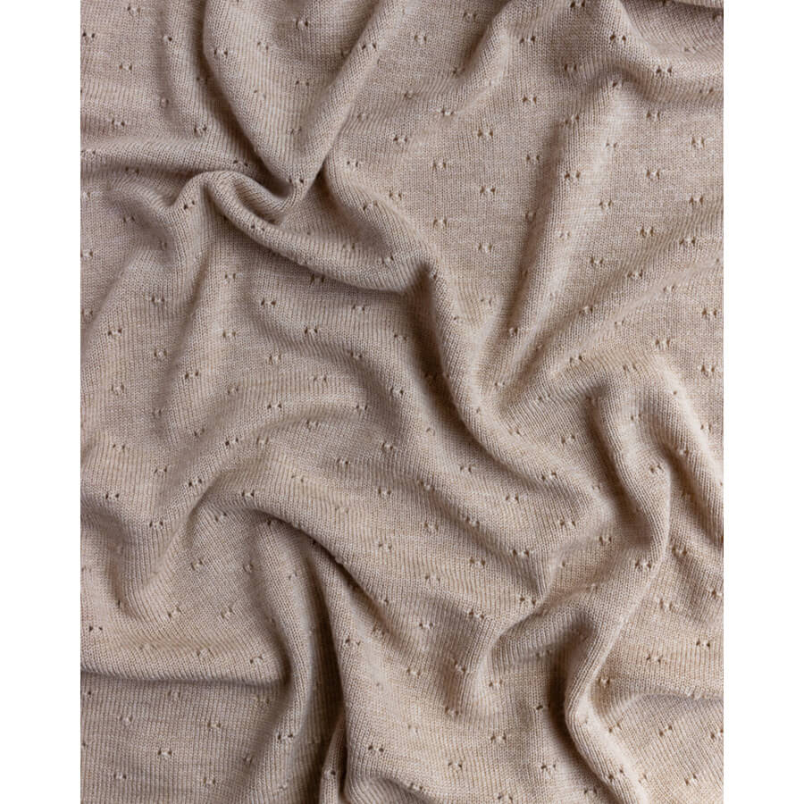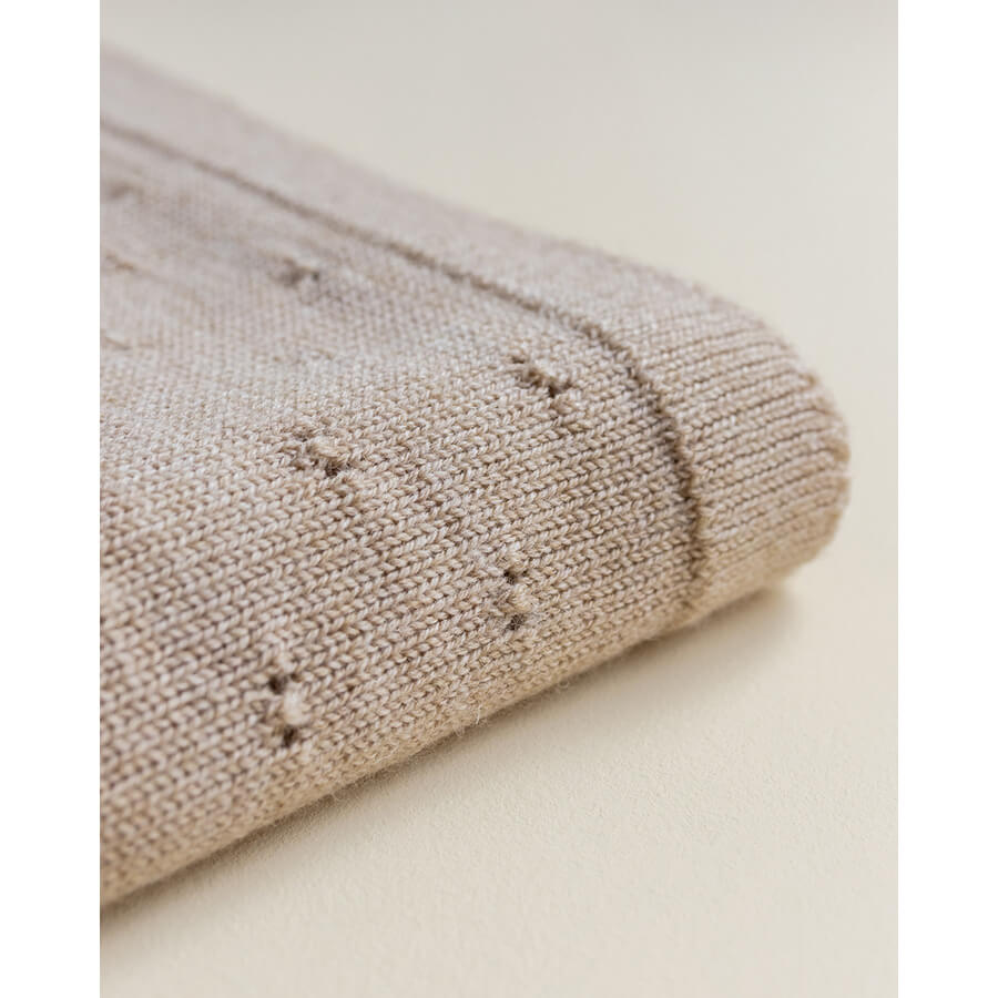 Wunderschöne und weiche Decke „Bibi Sand“ von Hvid, handgestrickt aus natürlicher und weicher Merinowolle. Die Babydecke hat eine dezente Farbe und ist eine tolle Decke für Neugeborene.