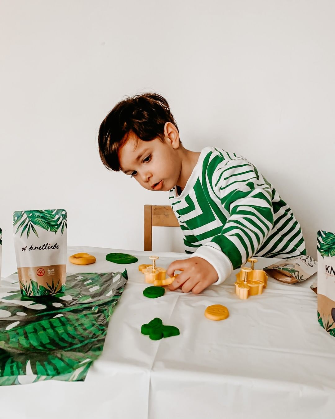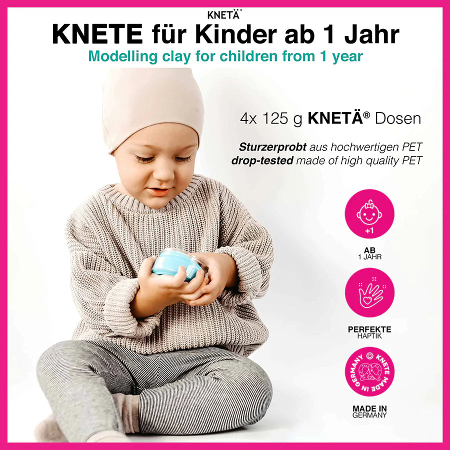 Vegane Kinderknete im 4er Set von KNETÄ in den Farben Pink, Blau, Grün und Gelb aus absolut unbedenklichen Inhaltsstoffen.