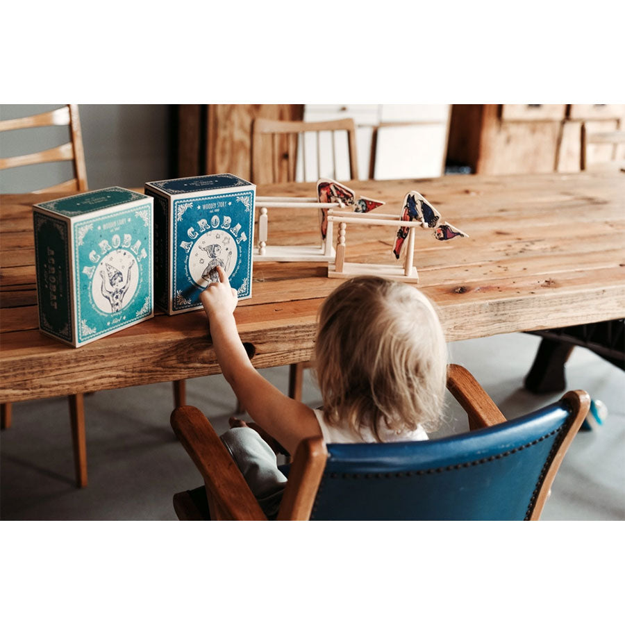 Hübsches Holzspielzeug „Acrobat Girl“ aus FSC-zertifiziertem Holz von Wooden Story. Die Figur kann Akrobatik an der Stange durchführen. Durch das Spielen trainiert das Kind seine feinmotorischen Fähigkeiten und Präzision. Nebenbei macht das Spielen Spaß und wirkt gleichzeitig beruhigend, durch seine gleichmäßigen und kreisenden Bewegungen, die der Akrobat macht. Das fördert auch die körperliche Aktivität.