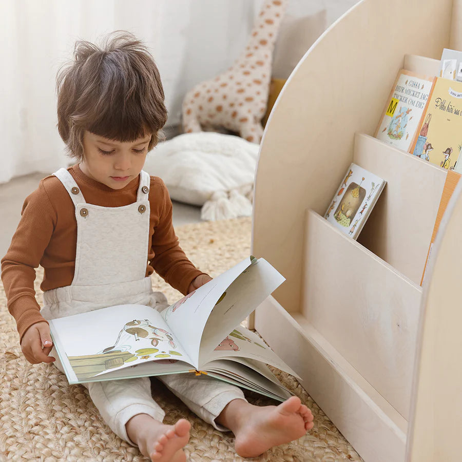 Kumpu von FitWood - mehr als nur ein Bücherregal! Hier kommt dein Kind ganz einfach an seine Lieblingsbücher, kann am eingebauten Tisch lesen, malen und basteln, durch den Spieltunnel krabbeln oder sich verstecken.
