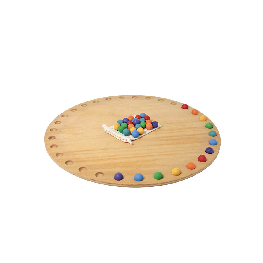 Holzscheibe mit 35 Holzkugeln.