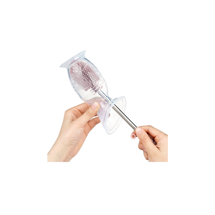 Auf der einen Seite befindet sich ein Bürstenkopf, der die perfekte Größe hat, um die Pumpen, Flaschen und Milchaufbewahrungsbeutel zu reinigen, und auf der anderen Seite gibt es eine Bürste mit einer abgewinkelten Spitze, um die Ecken und Kanten der Flaschensauger, Milchauffänger und vieles mehr zu erreichen!