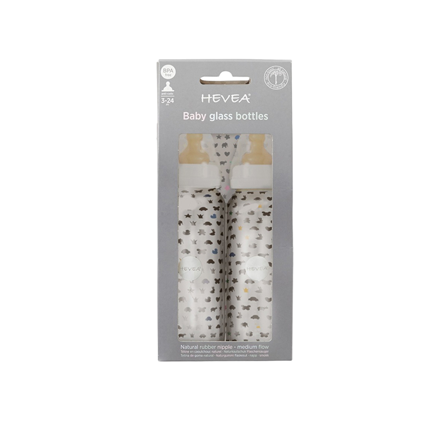 Ein 2er Set Babyflaschen von Hevea aus hochwertigem und temperaturbeständigem Borosilikatglas im schlichten HEVEA Design mit Naturkautschuksauger.