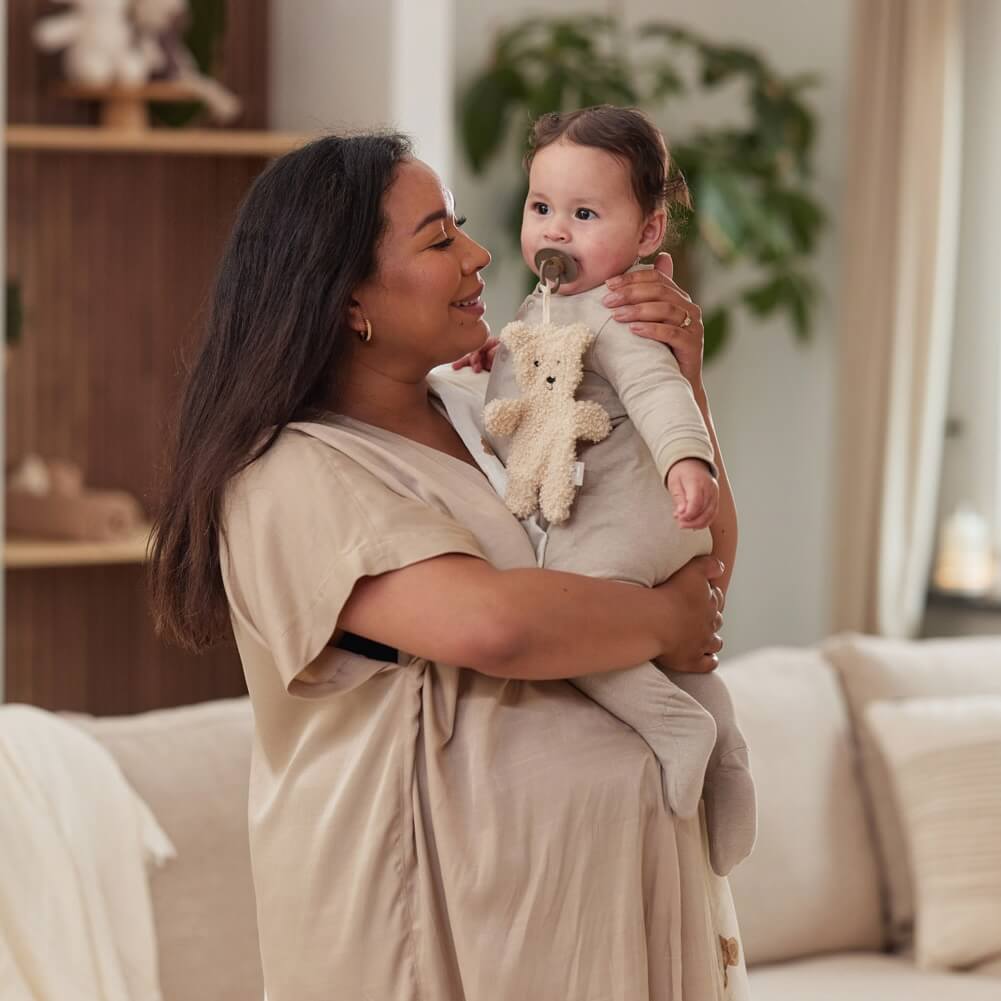Das Schnullertuch "Teddy Bear" von Jollein ist ein süßer, praktischer Begleiter für dein Baby. Die super softe Bouclé-Oberfläche fühlt sich angenehm an und lädt zum Greifen, Kuscheln und Spielen ein.