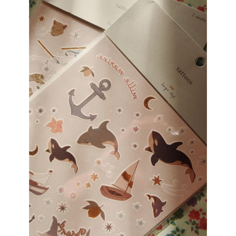 Die temporären Klebetattoos von Konges Slojd bestehen aus über 30 Motiven auf 2 Bögen und bieten Kindern vielseitigen Spielspaß. Die Tattoos lassen sich einfach mit Wasser oder einem feuchten Schwamm auftragen und wieder entfernen – sauber und unkompliziert.