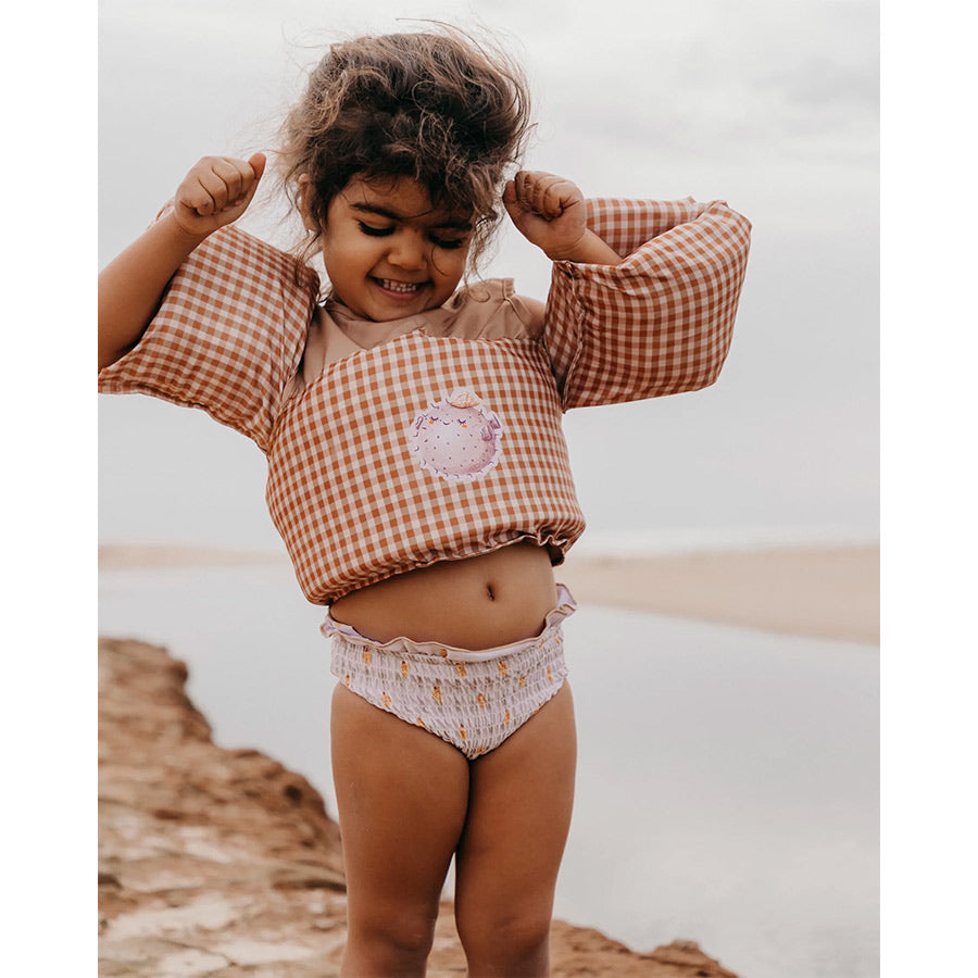 Die Schwimmweste Splasher von Mrs. Ertha besteht aus recyceltem Polyester und hat einen extra dichten und widerstandsfähigen Schaumstoff.