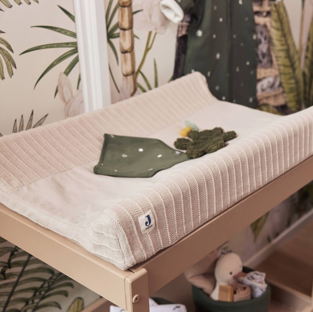 Der Wickelauflagenbezug "Pure Knit" von Jollein kombiniert Funktionalität mit stilvollem Design. Der weiche Strickstoff aus 100 % Bio-Baumwolle (GOTS-zertifiziert) verleiht der Wickelkommode einen luxuriösen Look und sorgt dafür, dass dein Baby beim Wickeln angenehm weich und warm liegt.