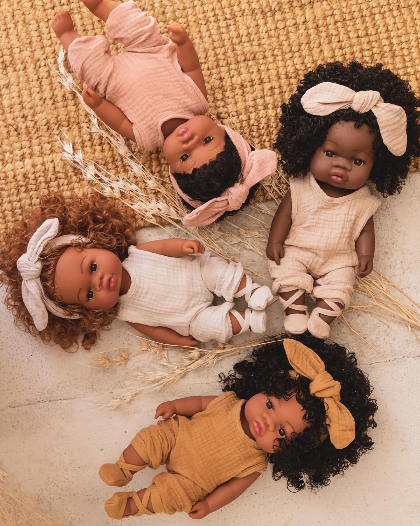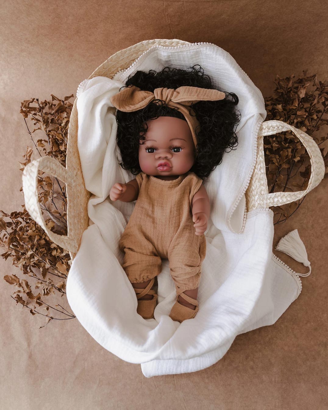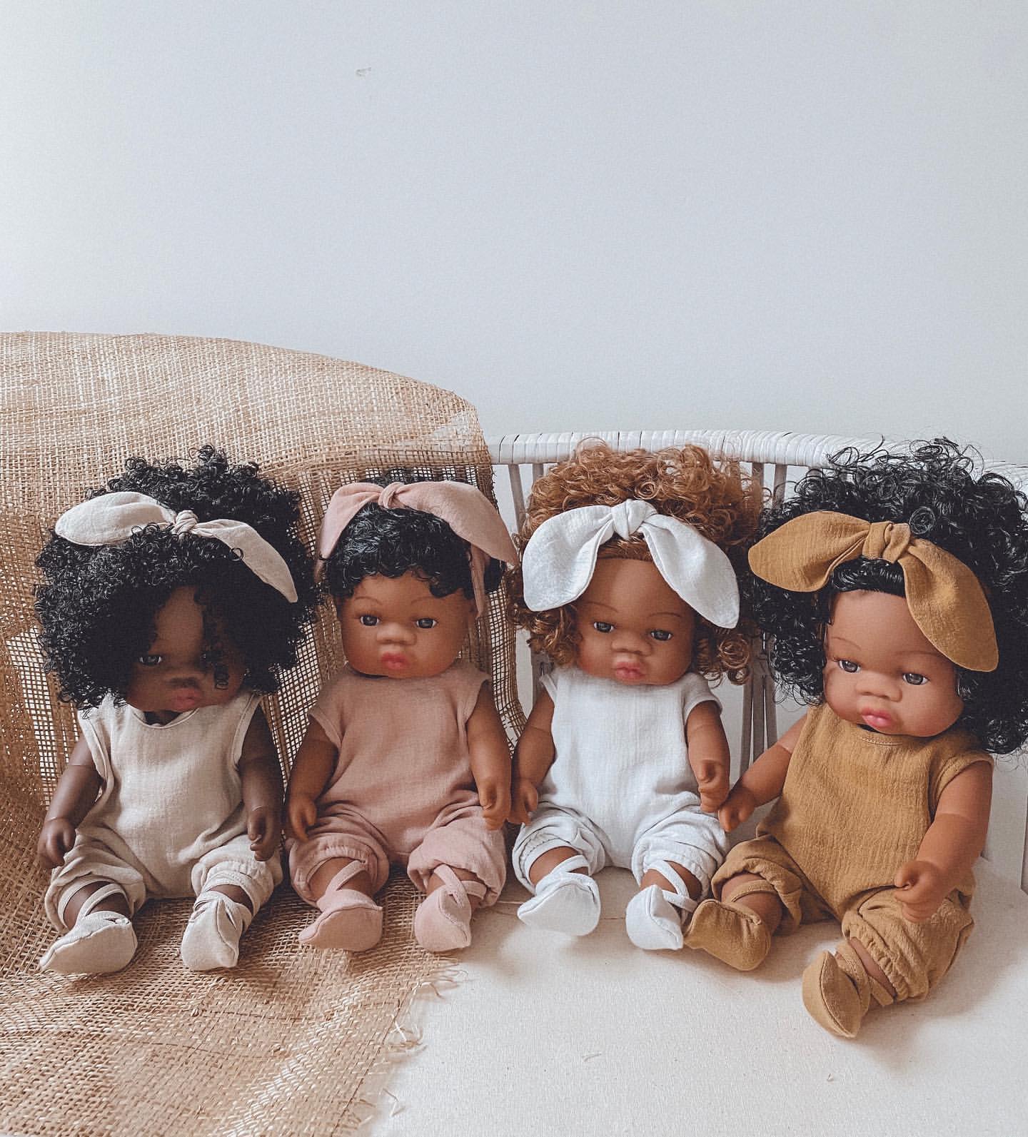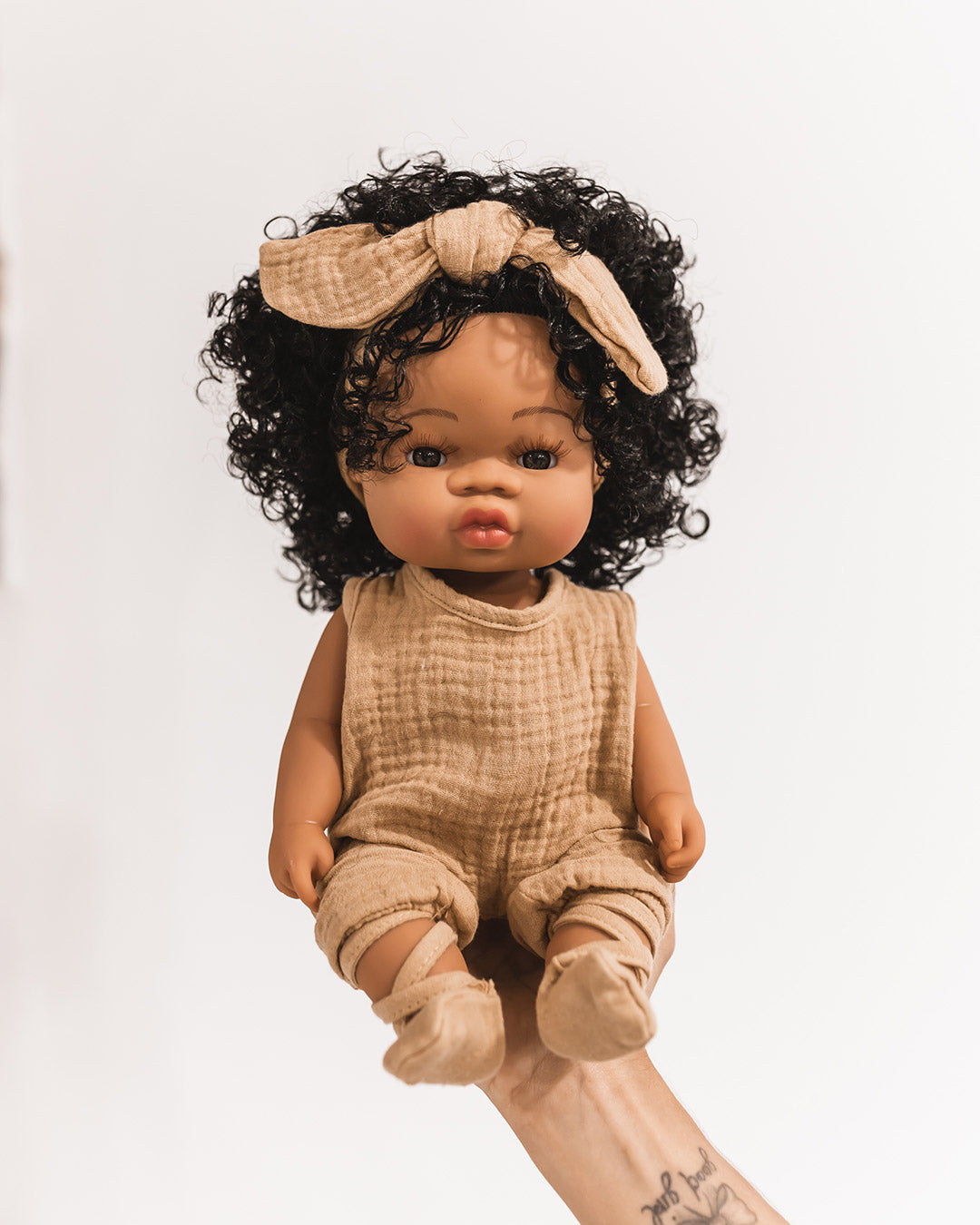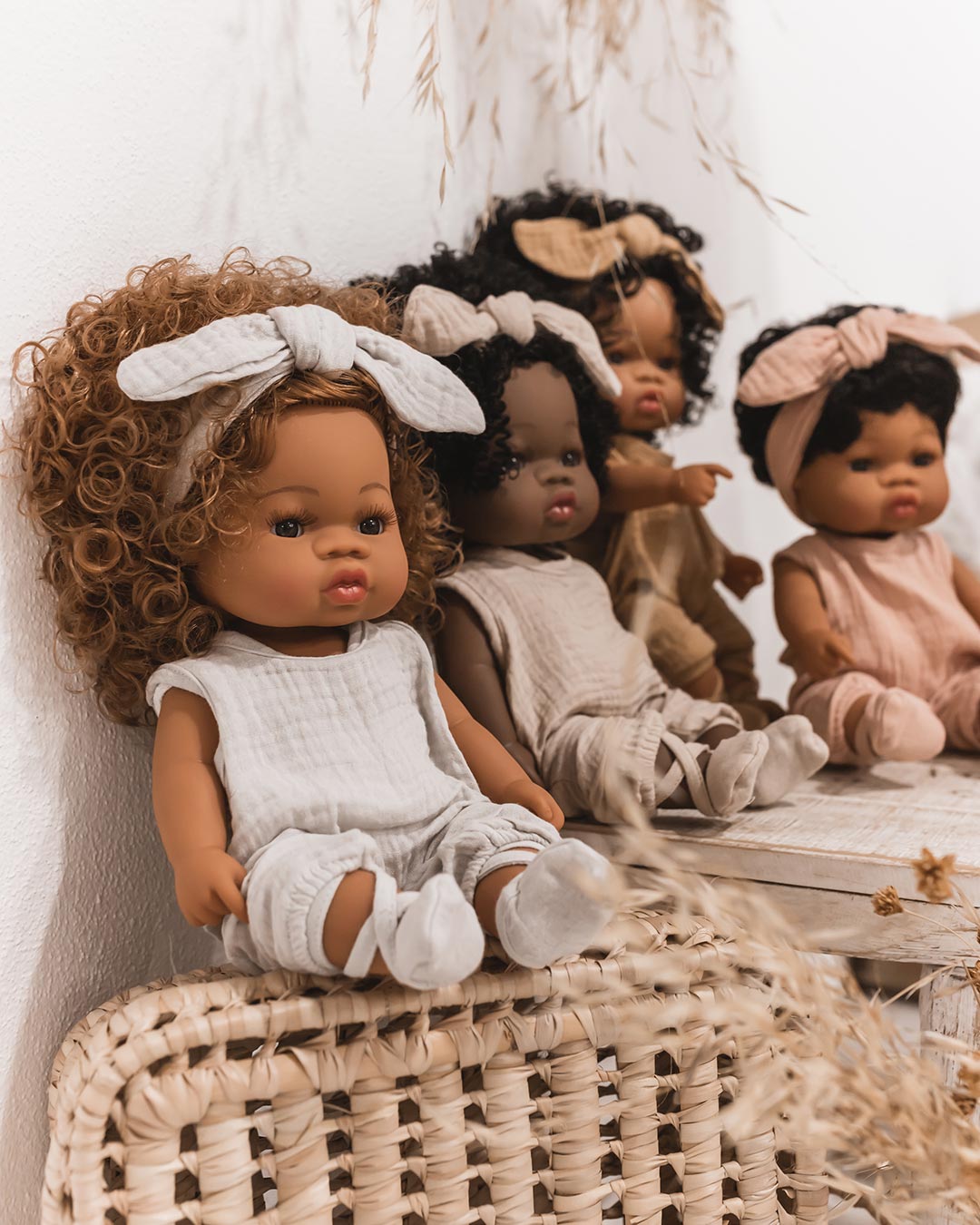 Jede Puppe enthält einen Satz Unterwäsche, ein Stirnband, einen Overall und ein Paar Schuhe, die in Portugal aus 100% Bio-Baumwollgaze handgefertigt wurden.