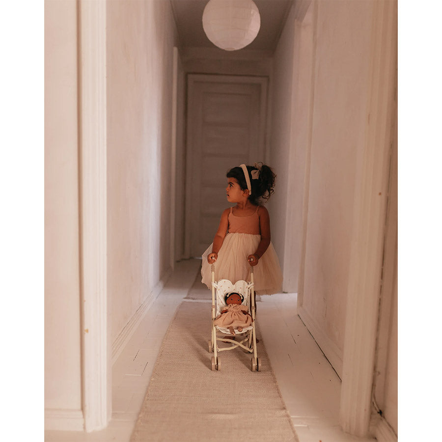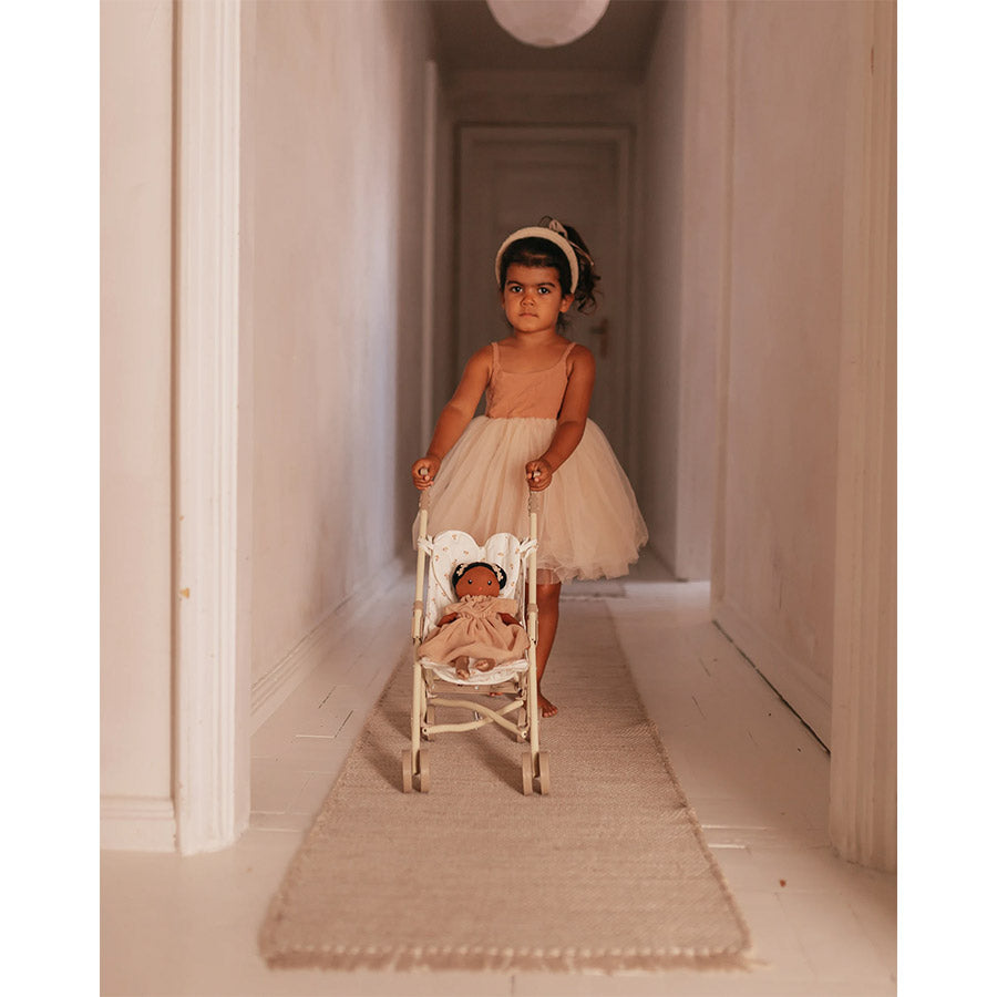 Der Kinderwagen besteht aus Bio-Baumwolle und hat einen abnehmbaren Stoffsitz. Dazu verfügt er über eine herzförmige Tasche, in der kleine Accessoires aufbewahrt werden können. Doppelräder für guten Stand und Metallgestell für Stabilität. Ein absolutes Must-Have für kleine Puppen-Fans.
