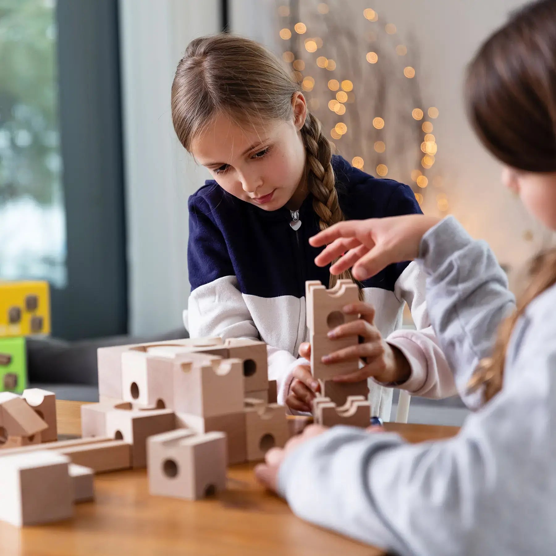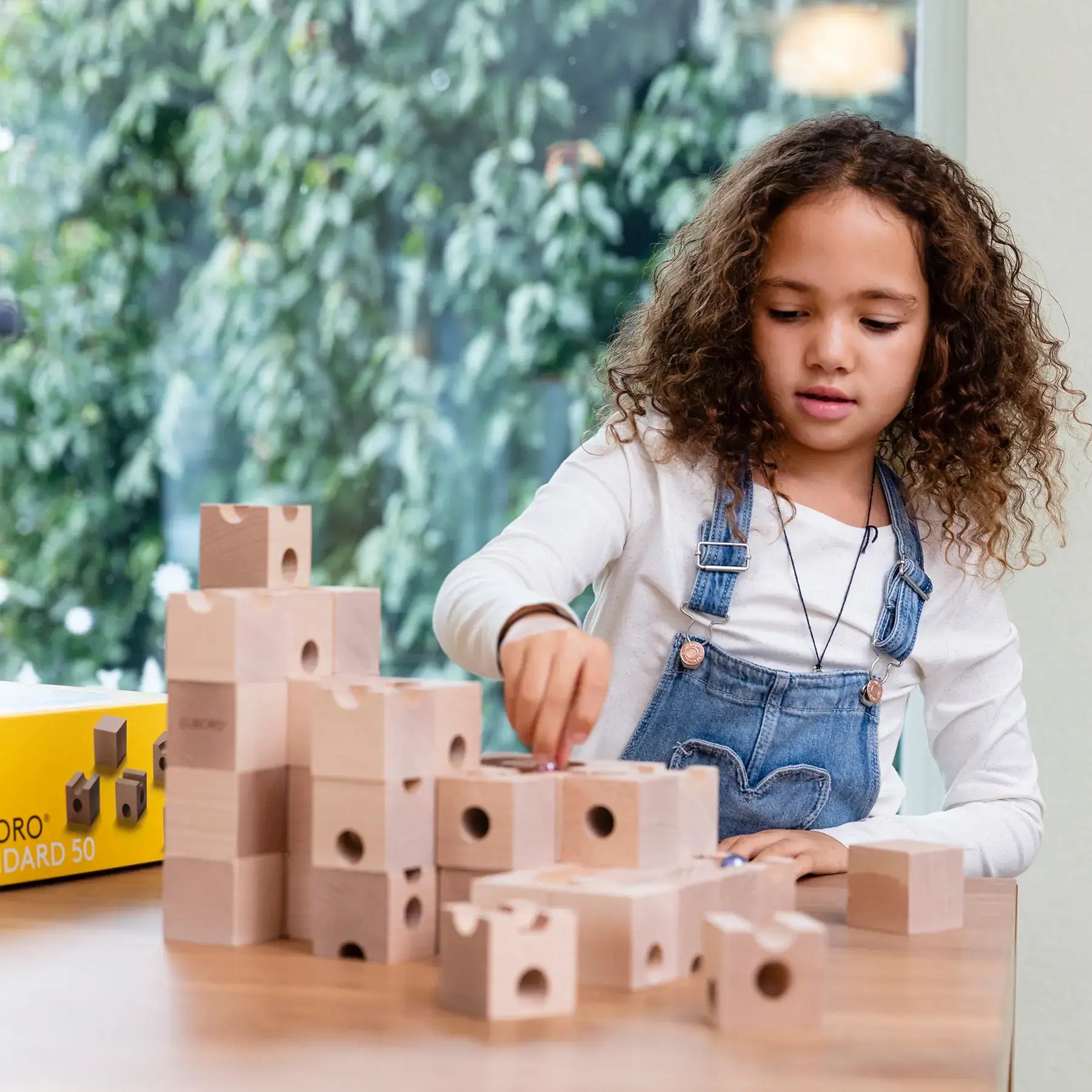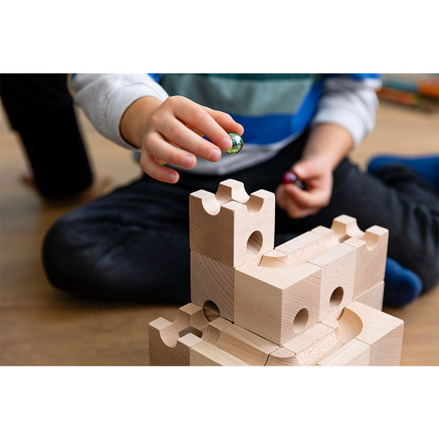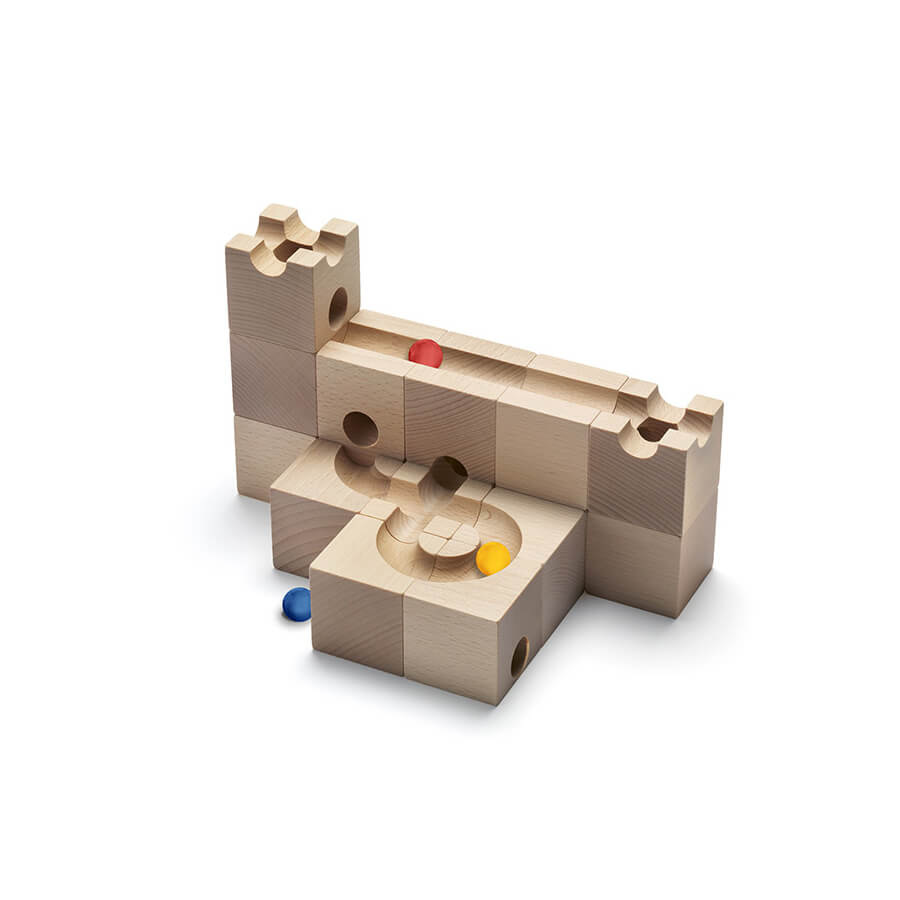 Mit den präzise gefertigten Holzelementen aus naturbelassenem Schweizer Buchenholz erschaffen Kinder und Erwachsene faszinierende Kugelbahnen voller Logik, Kreativität und Überraschungen.
