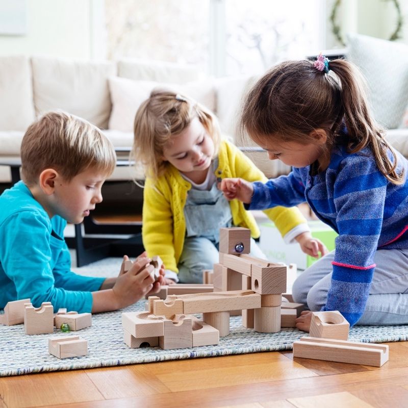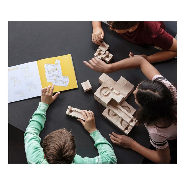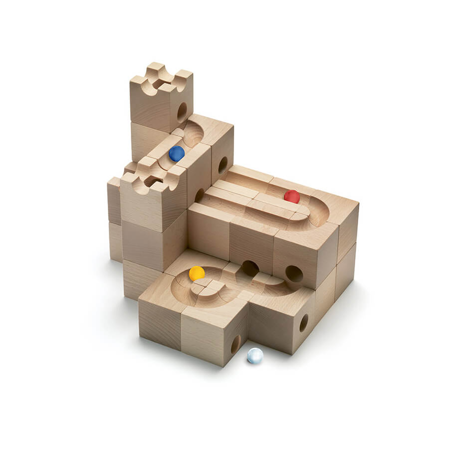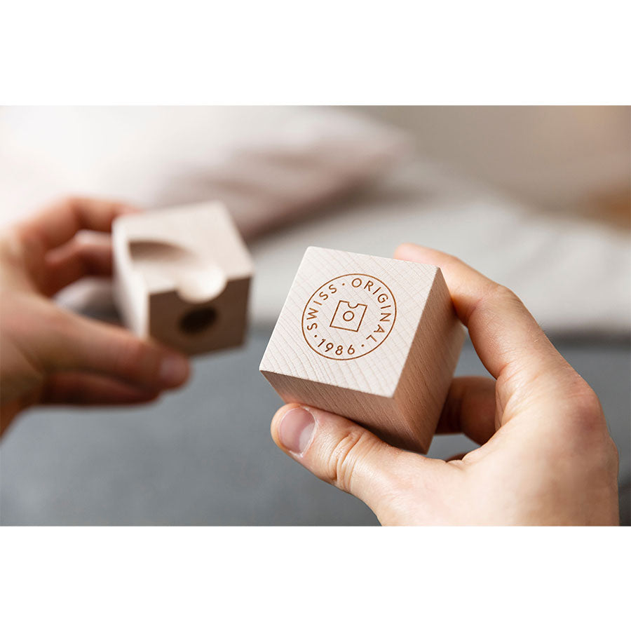 Mit den präzise gefertigten Holzelementen aus naturbelassenem Schweizer Buchenholz erschaffen Kinder und Erwachsene faszinierende Kugelbahnen voller Logik, Kreativität und Überraschungen.