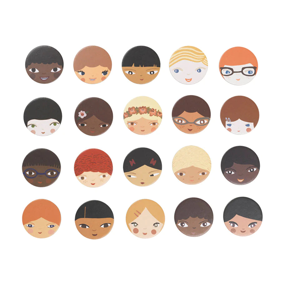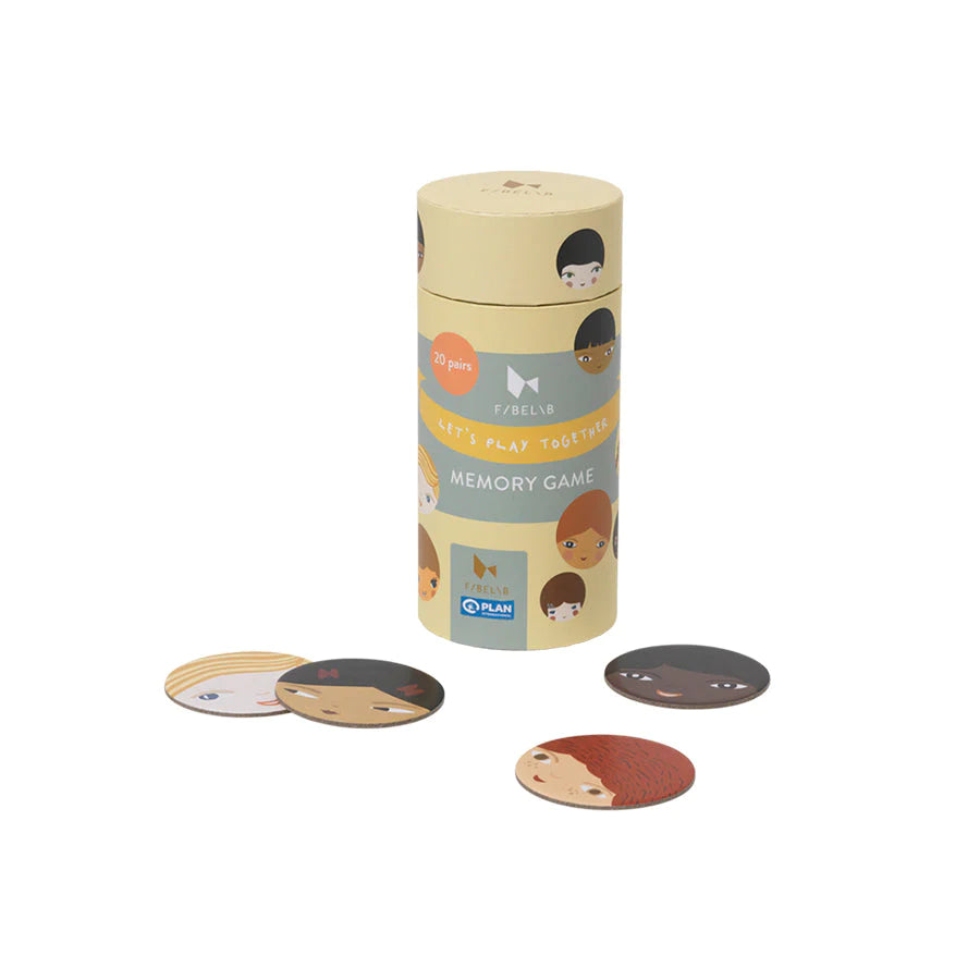 Süßes Memory-Spiel „Lets Play Together“ mit zauberhaften Illustrationen der Gesichter der Fabelab-Figuren, verschiedene Gesichter müssen zugeordnet werden.