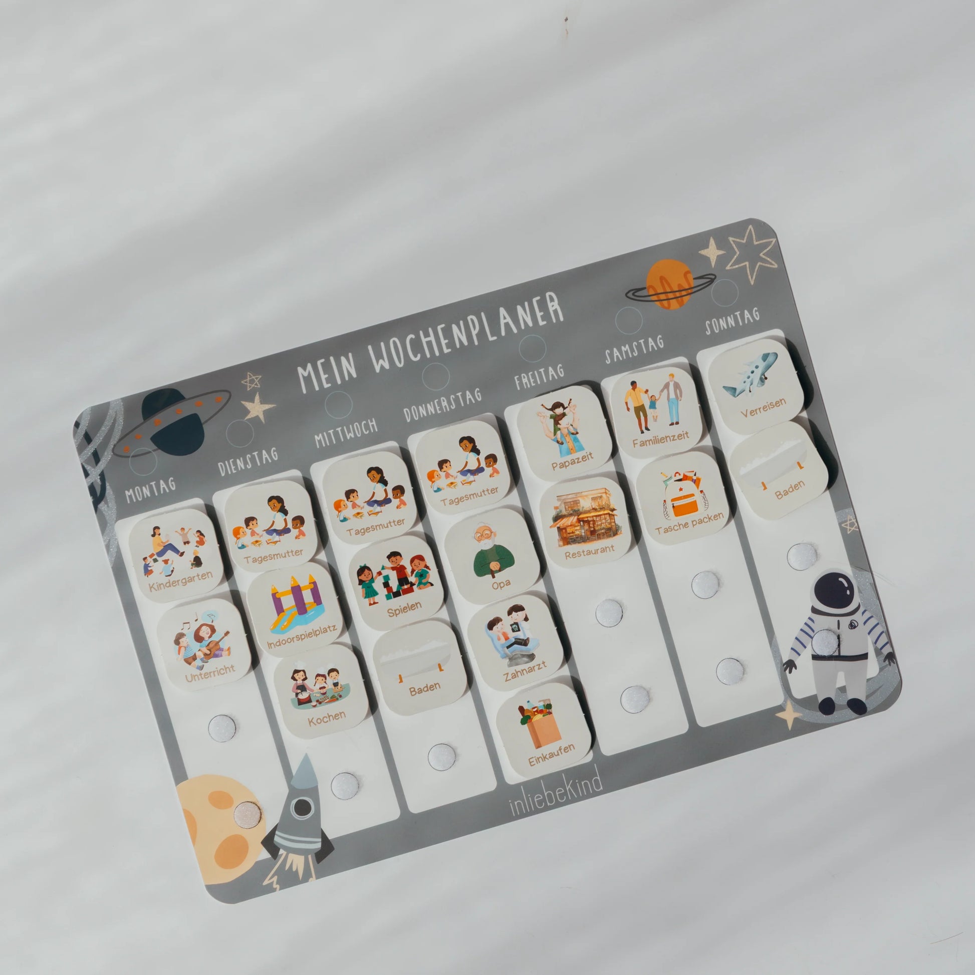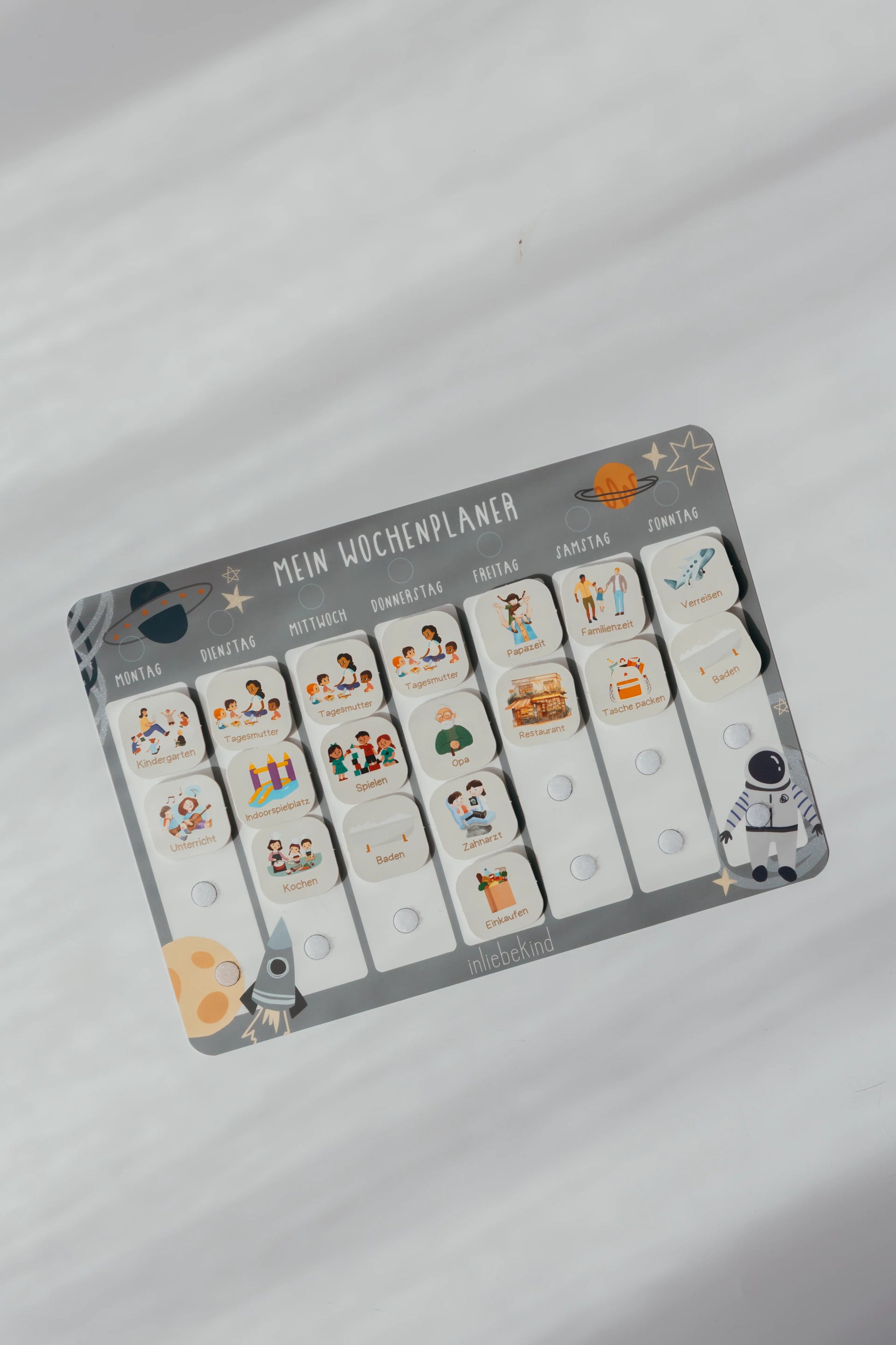 Der Wochenplaner von Inliebekind strukturiert den Familienalltag spielerisch und interaktiv und fördert Selbstständigkeit sowie Organisationsfähigkeit von Kindern.