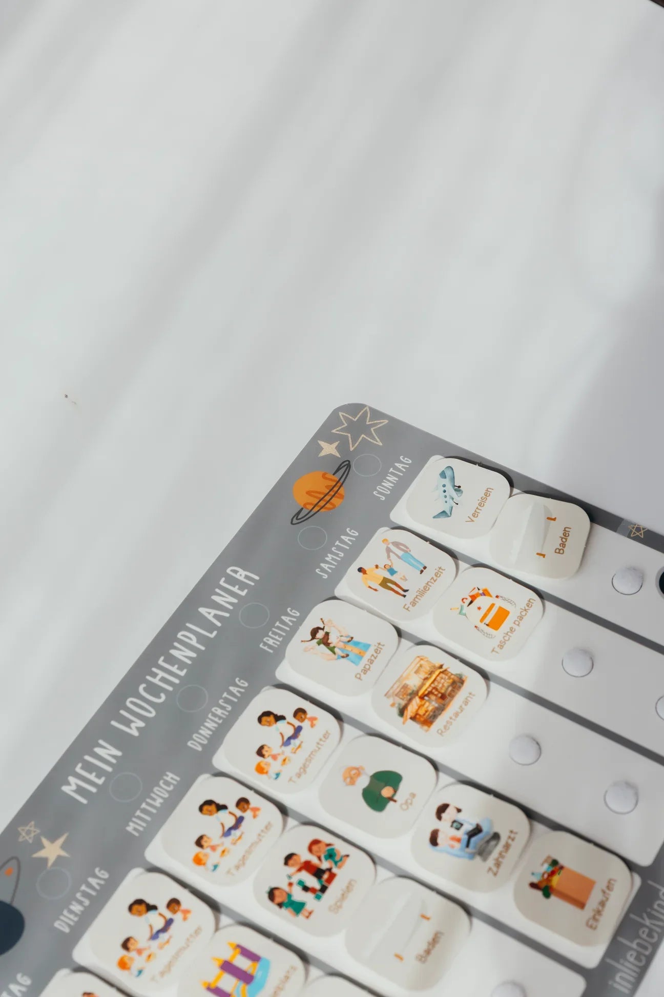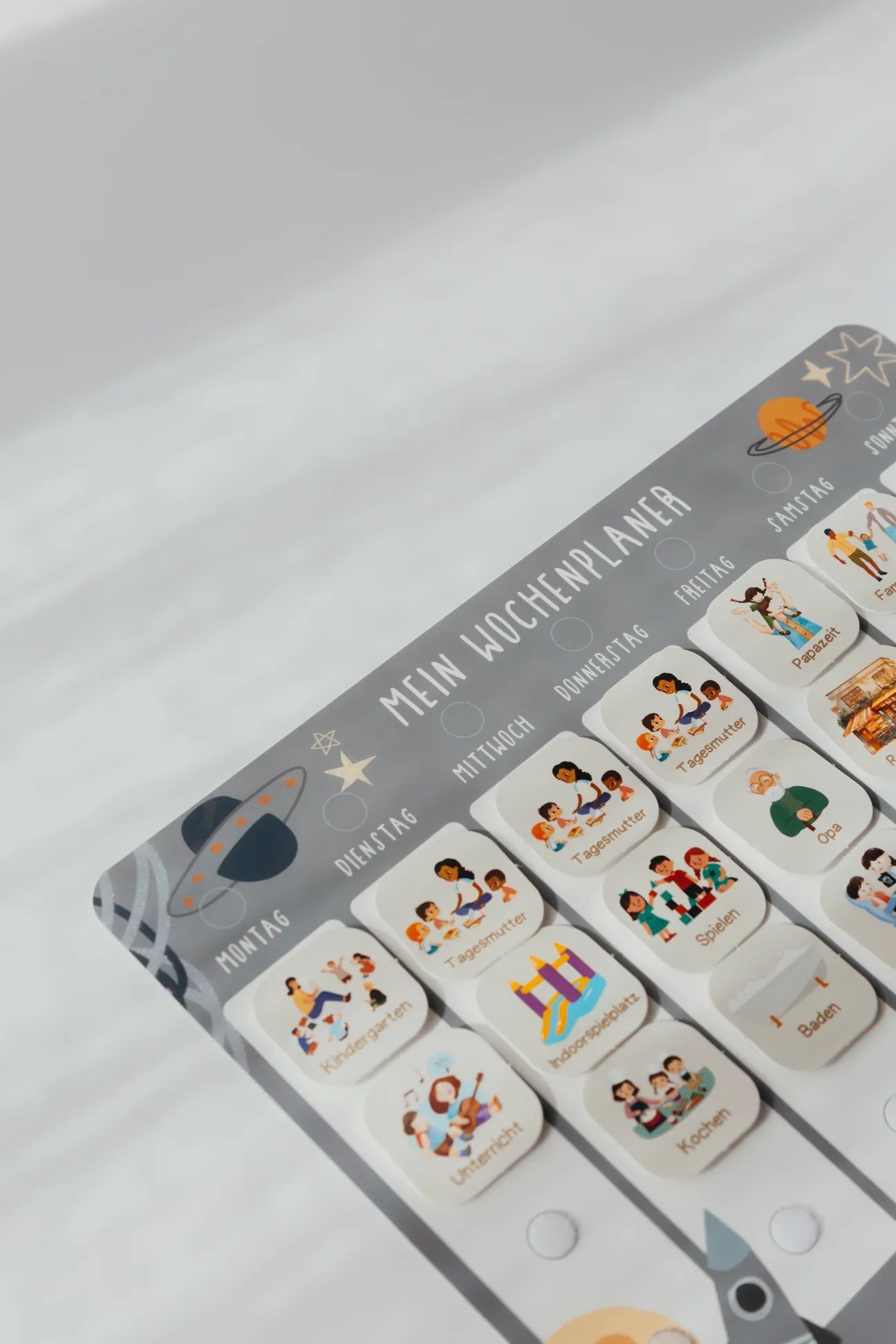 Dank Klettpunkten lassen sich die Karten jederzeit neu arrangieren. Stabil, laminiert und so fest wie eine Kreditkarte wird die Wochenplanung zu einem kreativen Erlebnis für die ganze Familie.