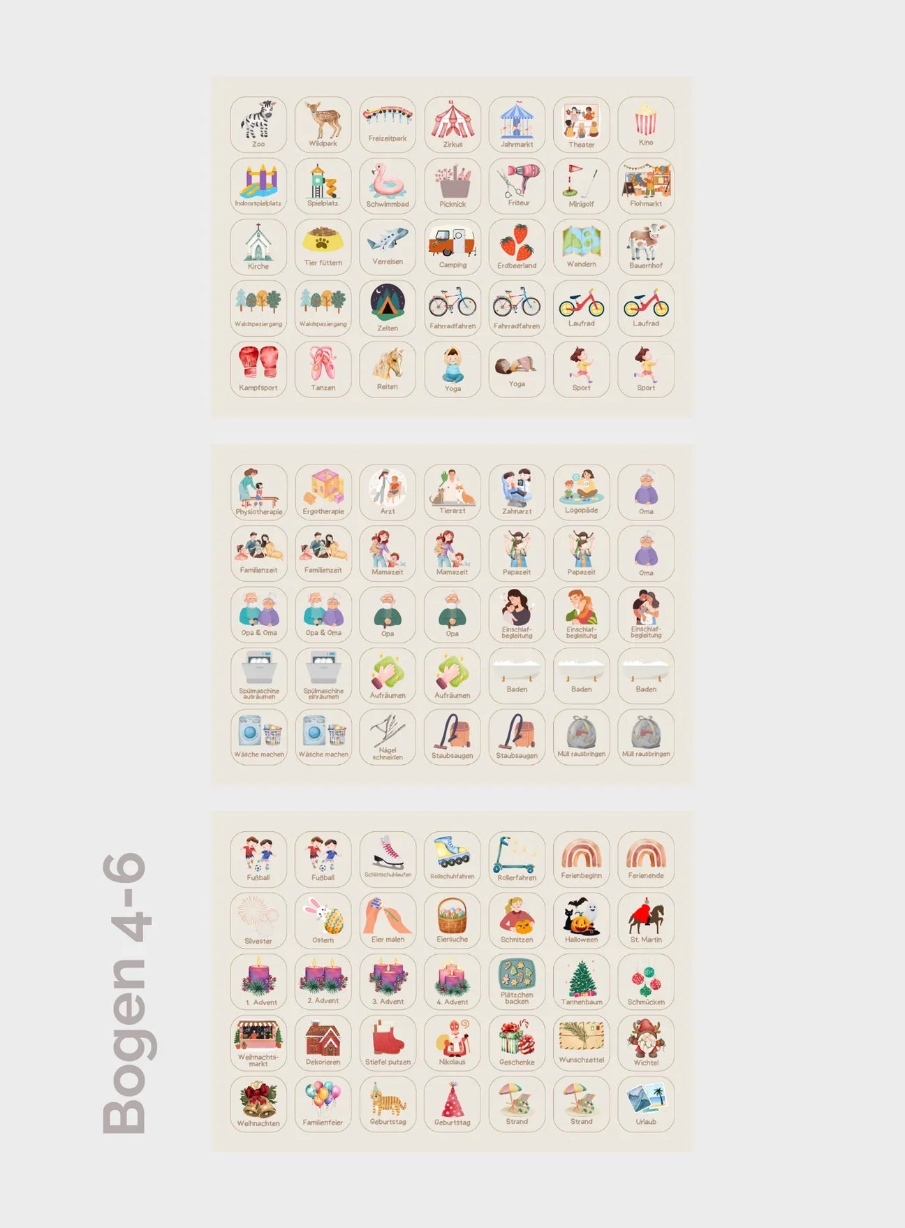 9 Bögen mit insgesamt 315 gestanzten, knickfesten Routinekärtchen ermöglichen eine flexible Wochenplanung. Ein unbedruckter Bogen mit 35 individuell beschreibbaren Kärtchen bietet Raum für eigene Aufgaben und Motive.