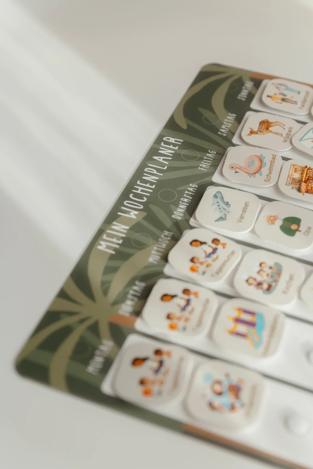 Dank Klettpunkten lassen sich die Karten jederzeit neu arrangieren. Stabil, laminiert und so fest wie eine Kreditkarte wird die Wochenplanung zu einem kreativen Erlebnis für die ganze Familie.