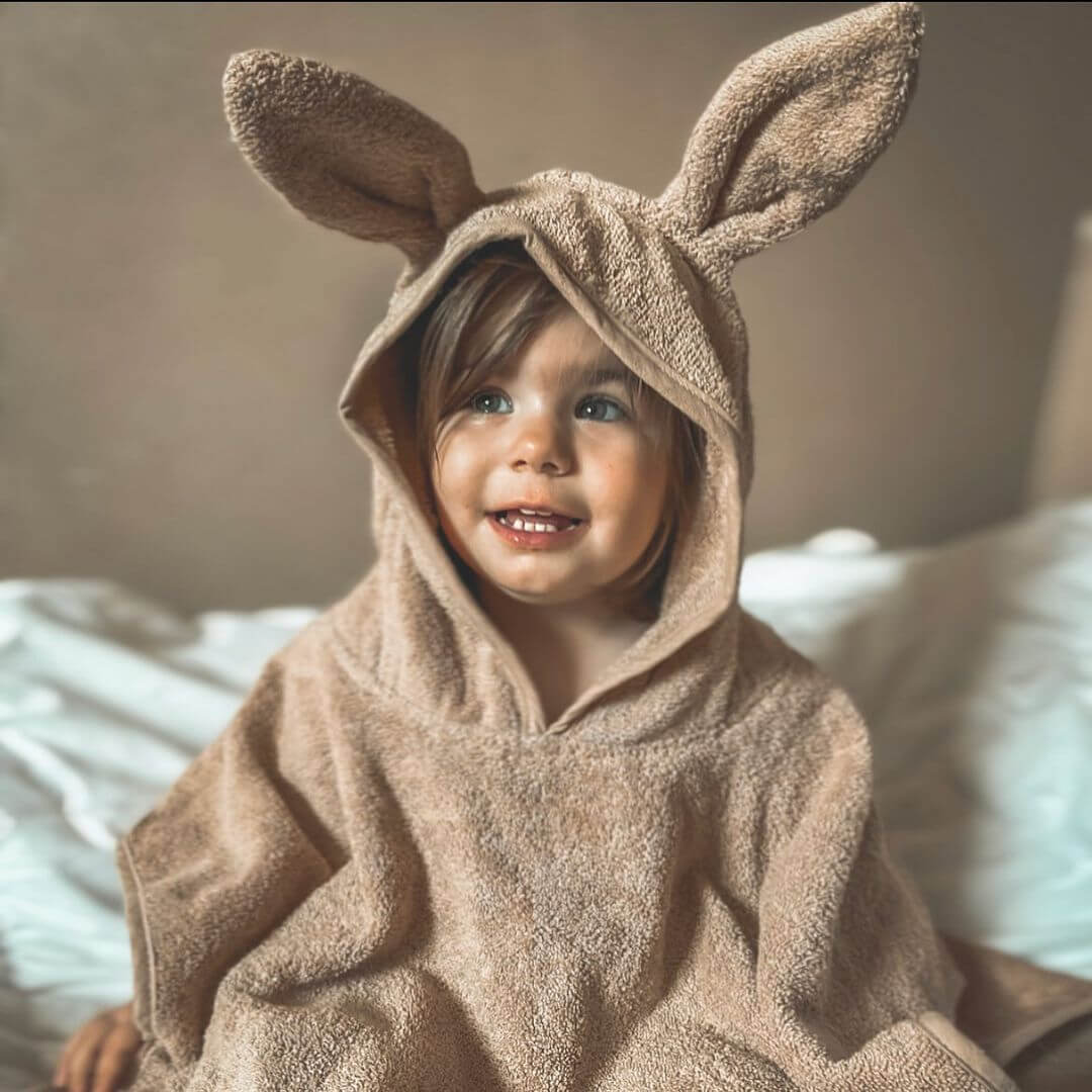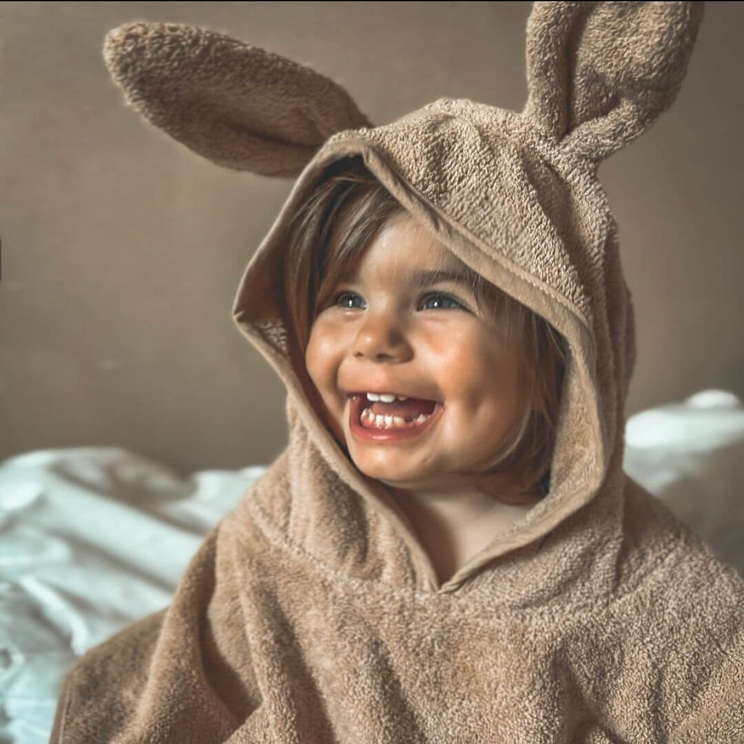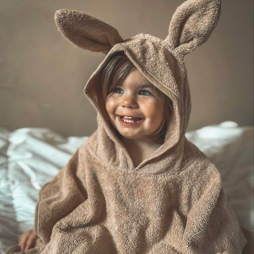 Die Kapuze mit süßen Hasenohren schützt den Kopf vor Auskühlung und sorgt für extra Gemütlichkeit. Dank der praktischen Größe ist der Poncho ideal für Kinder von 1 bis 4 Jahren und lässt sich leicht an- und ausziehen.
