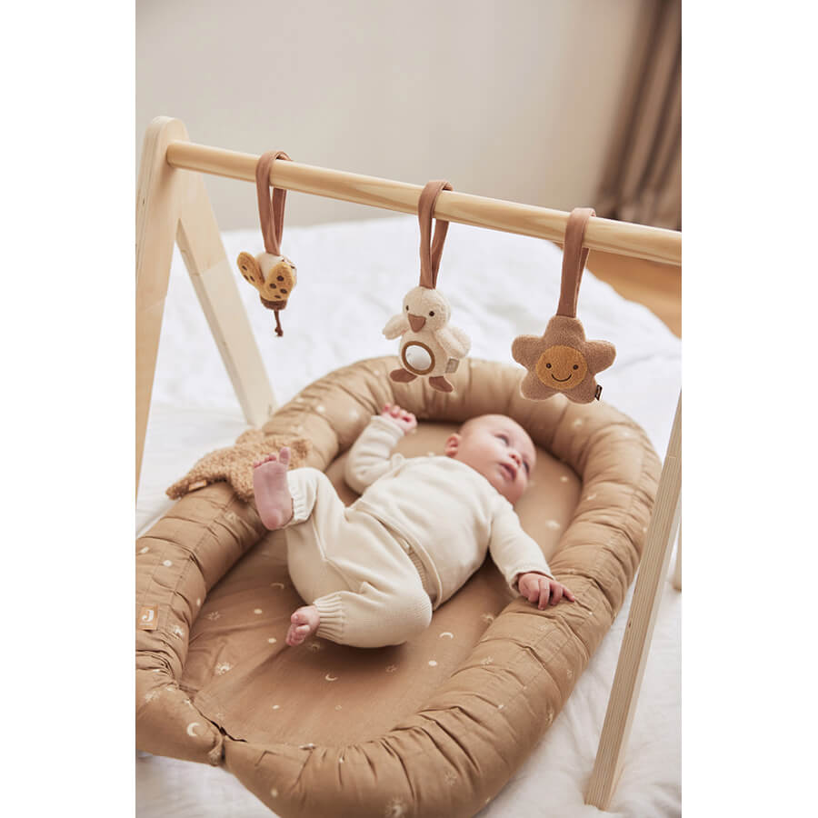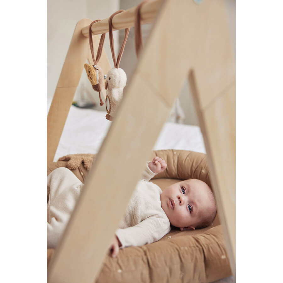 Unter dem stabilen Holzgestell kann dein Baby lauschen, beobachten und nach den Spielzeugen greifen – das stärkt die Sinne und trainiert die Hand-Auge-Koordination. Dank der vier stabilen Beine steht der Spielbogen sicher auf jeder Oberfläche und kann flexibel mit verschiedenen Anhängern gestaltet werden.