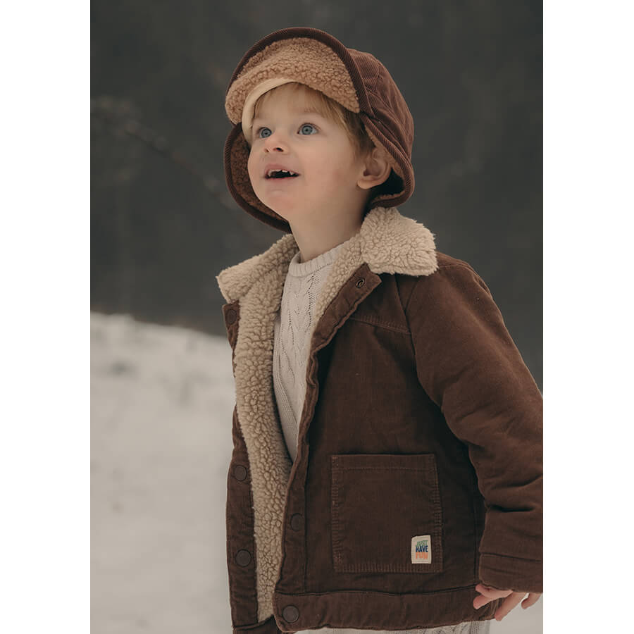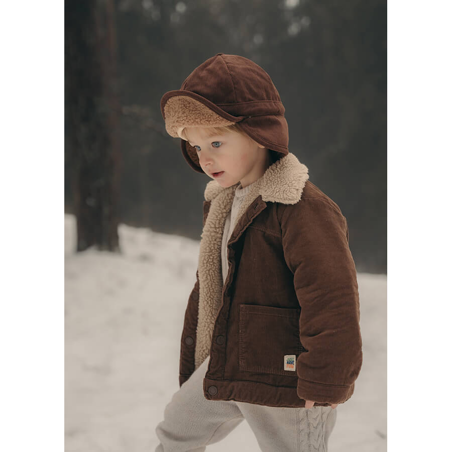 Mit der coolen Wintermütze von Mrs Ertha aus 100 % recyceltem Polyester bleibt der Kinderkopf auch an kälteren Tagen warm.