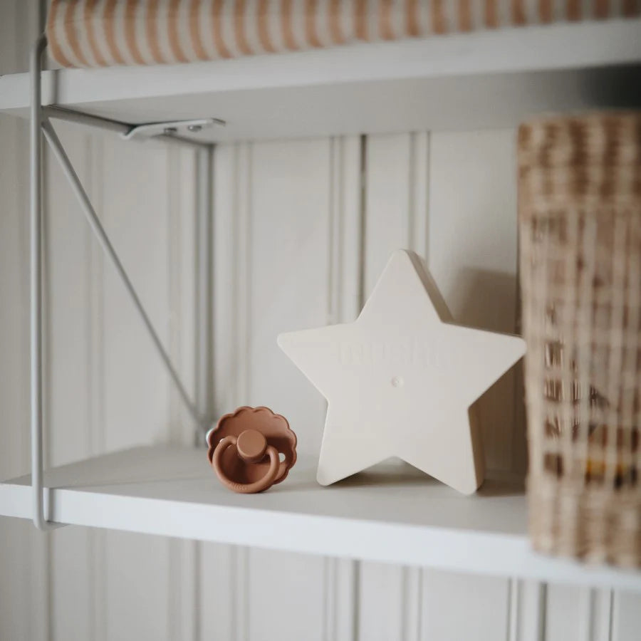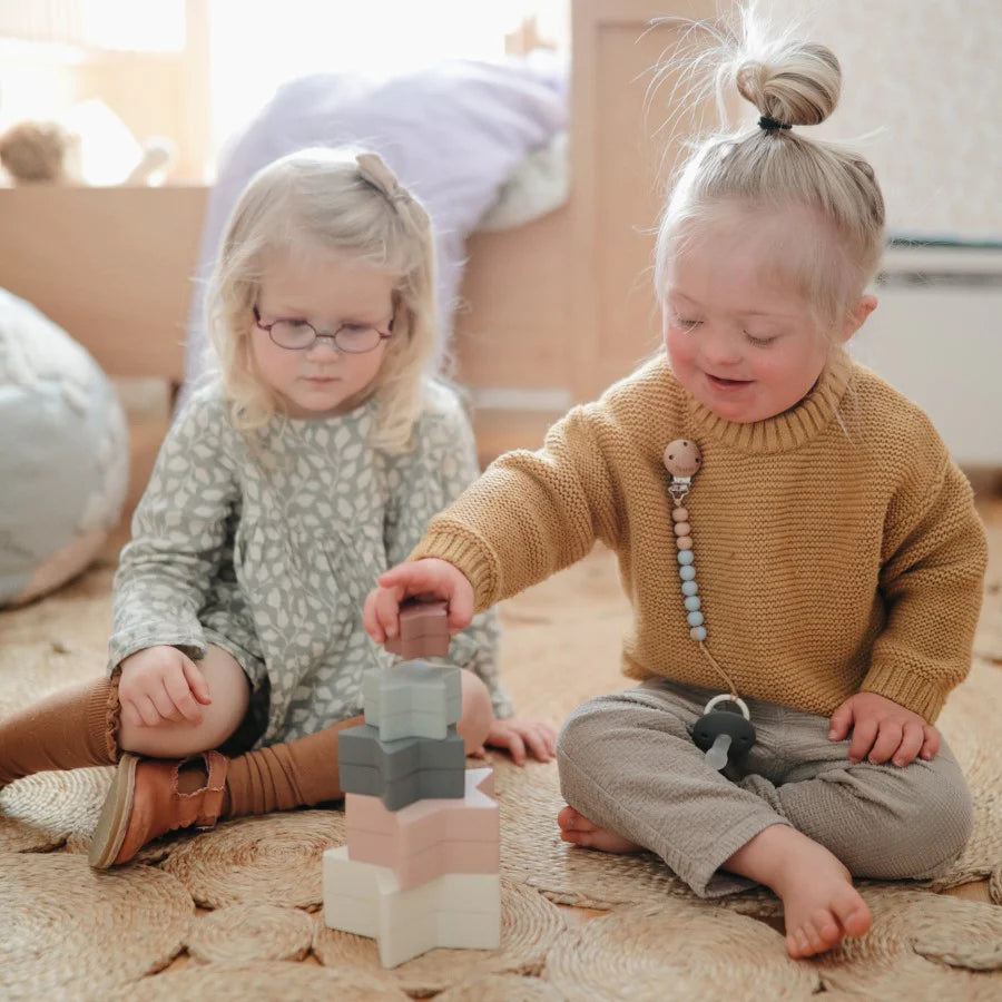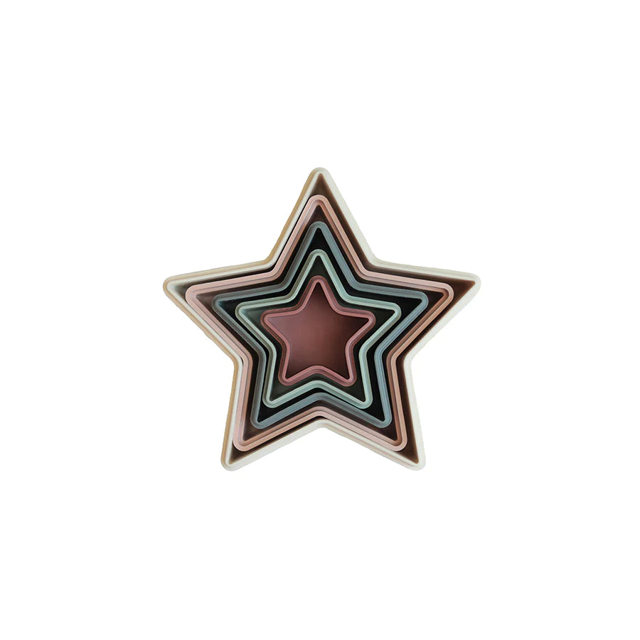 Süßes Stapelspielzeug „Nesting Stars“ in Sternenform von Mushie aus der Hygge-Kollektion für Kinder von 0 bis 3 Jahren.